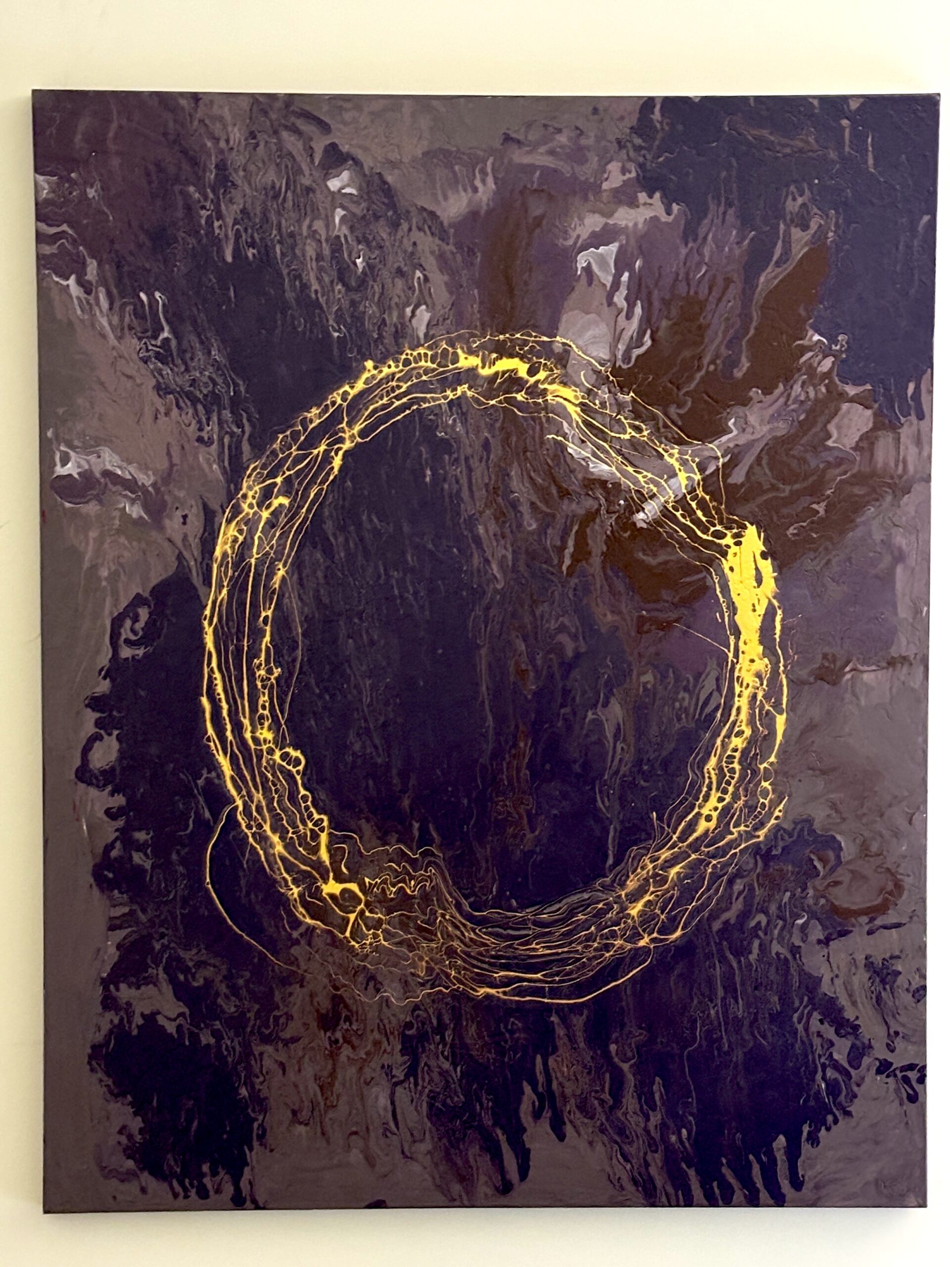 Eternity shows how the motion of life can be calmed through connection, continuation, completion, and all the feelings a circle represents. The large format of this painting is best displayed in a space where the viewer can stand away from the canvas, as well as up close.